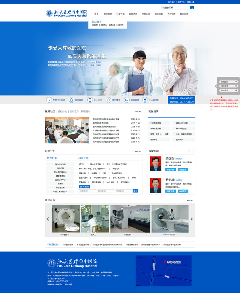 北大醫(yī)療魯中醫(yī)院始建于1966年,歷經(jīng)40余年,現(xiàn)已發(fā)展成為魯中地區(qū)一所集醫(yī)療、保健、科研、教學、急救于一體的三級綜合醫(yī)院。醫(yī)院占地面積45800平方米,建筑面積44402平方米,實際開放床位686張。醫(yī)院技術力量雄厚,現(xiàn)有職工981人,衛(wèi)生技術人員825人,其中主任醫(yī)師11人,副主任醫(yī)(技)師106人,主治(主管)醫(yī)(技)師248人,研究生導師人數(shù)4人。擁有目前國內(nèi)先進西門子“4D”雙源CT、1.5T磁共振、Philips V3000 DSA、高壓氧艙、膠囊胃鏡、西門子鉬鎢雙靶數(shù)字化乳腺機、全自動生化分析儀、美國GE四維彩超、全數(shù)字化X攝像系統(tǒng)(DR)等先進設備,先后開展了數(shù)字減影全腦血管造影、腦動脈狹窄球囊擴張支架植入術、腫瘤介入治療、肝炎病毒基因監(jiān)測、鞍區(qū)腫瘤切除、髖、膝關節(jié)置換、鼓室成形、胎兒表面超聲三維成像、艾滋病篩查、CT掃描三維成像、介入起搏器植入、心臟搭橋、纖支鏡下肺泡灌洗 、B超及CT引導下進行腫瘤穿刺活檢及射頻消融術、宮頸DNA倍體細胞檢測等技術130余項,擁有淄博市首家廣泛應用于臨床的遠程會診中心,患者在本院即可得到北京301醫(yī)院及上海等多家遠程機構的國家級知名專家的診治,贏得最佳的治療時機。醫(yī)院設有主要業(yè)務科室34個,其中心內(nèi)科、消化內(nèi)科、職業(yè)病呼吸內(nèi)科科、燒傷皮膚科為淄博市特色???。教學科研成果顯著,市級以上科研成果十余項,省部級以上刊物發(fā)表論文500余篇。現(xiàn)為濰坊醫(yī)學院附屬醫(yī)院、濱州醫(yī)學院教學醫(yī)院。